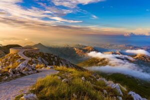 Beautiful sunset view from Lovćen Mountain, Montenegro, featuring a scenic walkway and stunning landscape.